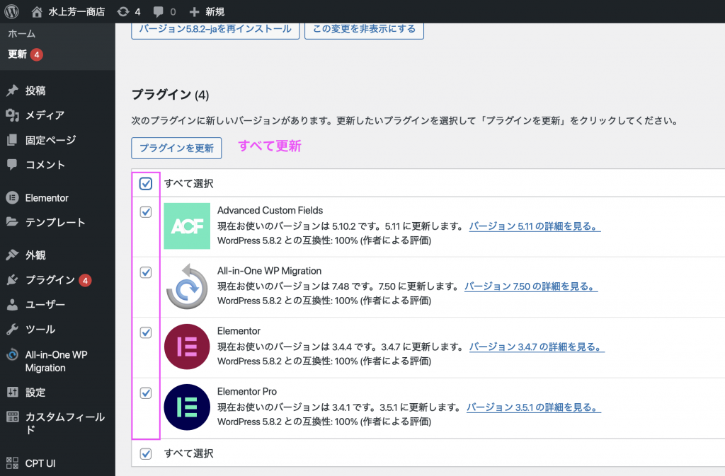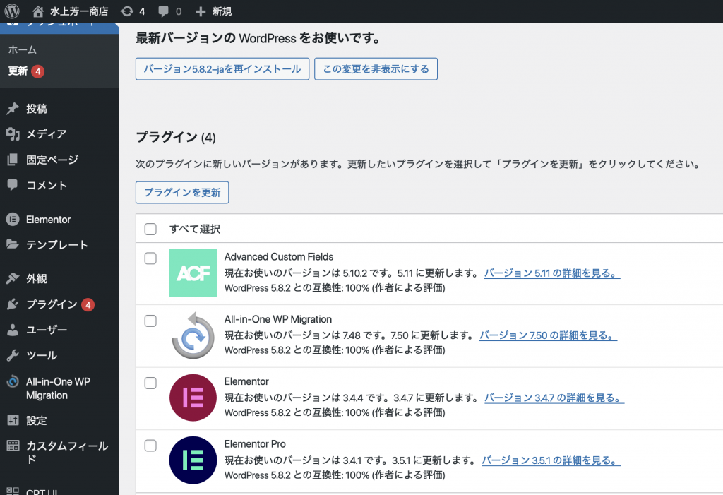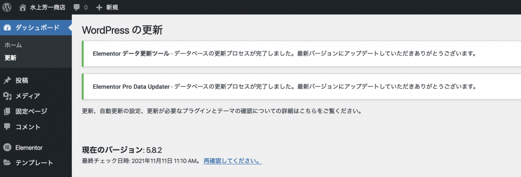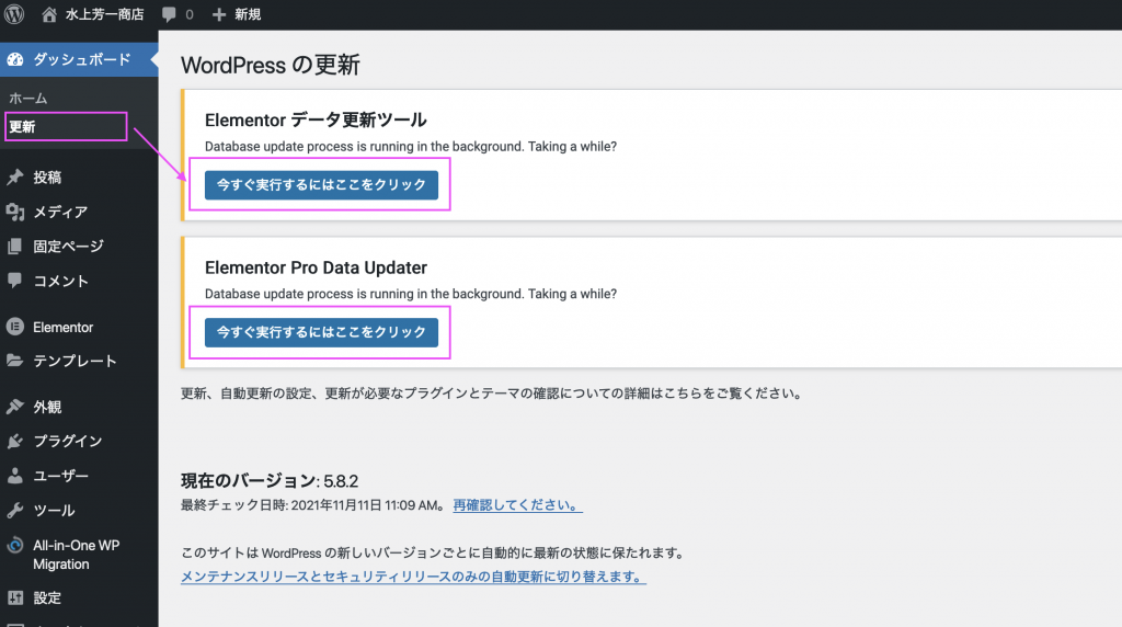 バックアップ完了後、Elementorを含むすべてのプラグインをアップデートします