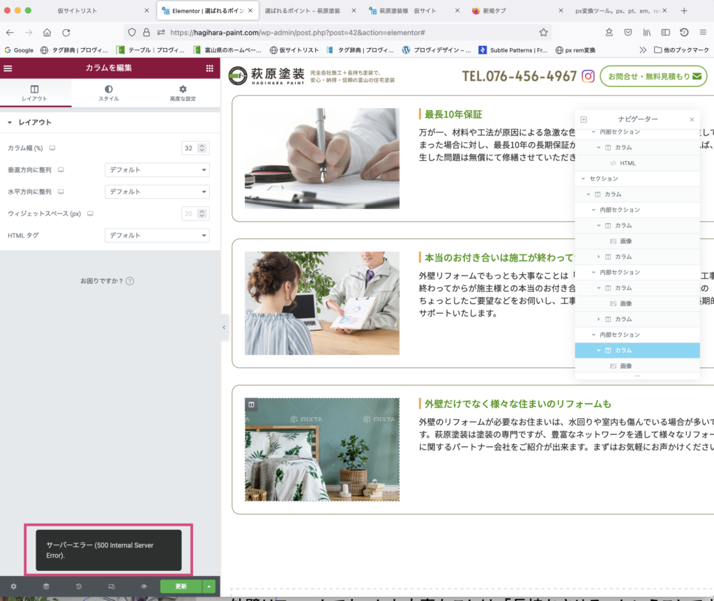 ↓エレメンターの保存時にこのようなサーバーエラーが起こり保存できない場合があります。