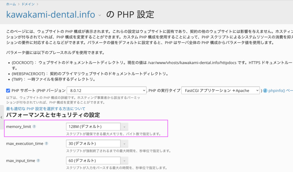 解決方法は、下記の画像のようにphpのメモリを増量すると解決できます。
