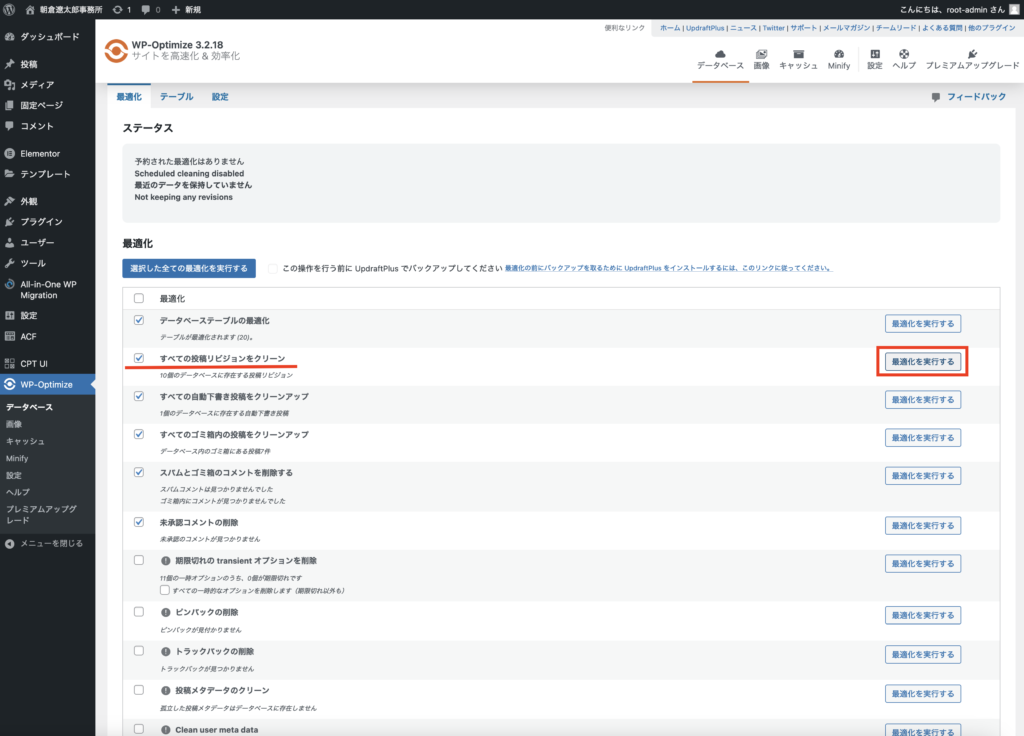 ダウンロードできたら「WP-Optimize」のページに移動してすべての投稿リビジョンをスクリーン → 最適化を実行する